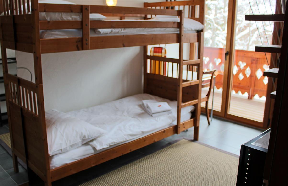 - 1 chambre avec lits superposés et mezzanine, sur laquelle se trouvent une télévision et une console Wii avec un canapé.